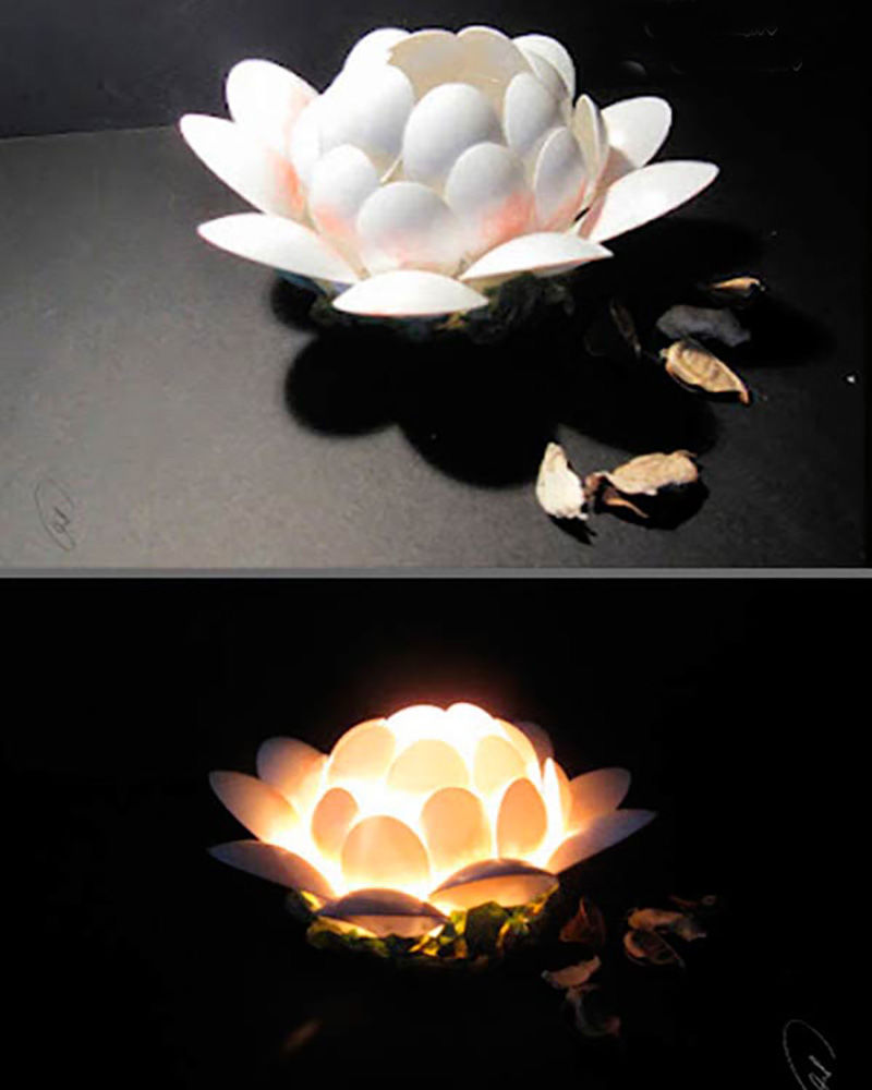 За това красиво цвете ще ви трябват същите лъжици без дръжки, лепило, пластмасови бутилки в бяло и зелено. Най-добре е да посетите занаятчийска работилница и да се научите да изработвате лилии.