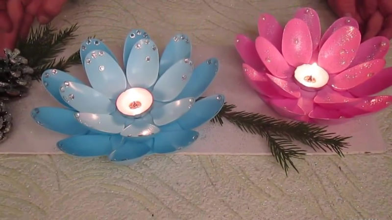 Свещите в оригинални свещници, изработени от пластмасови лъжици, не са неуместни за парти. Необходими са лъжици и компактдискове. Трябва да си приготвите горещо лепило, акрилна боя, разтворител, шкурка, елементи за декорация, лак със спрей.