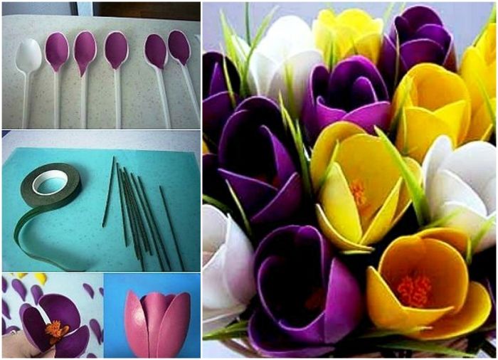 В един почивен ден вие и детето ви можете да направите прекрасен букет от лалета. Подгответе пластмасови лъжици с различна големина, велпапе и цветна панделка. За едно цвете са ви необходими пет лъжици.