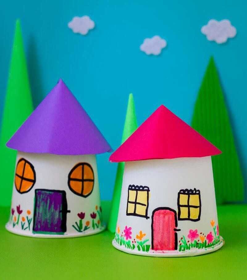 Обърнете ги с главата надолу, изрежете малък правоъгълник (врата) и готово - къщичките са готови. Останалото е в ръцете на въображението на детето ви. Можете да нарисувате прозорците с боя или флумастери или да ги направите като апликации.