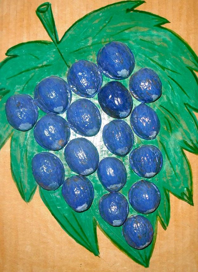 - Залепете първите черупки на фона на платното, с изпъкналата страна нагоре, в 2-3 реда по 5-6 "гроздови зърна", върху тях залепете втория слой, броят им е по ваша преценка. Създаден е клъстер.