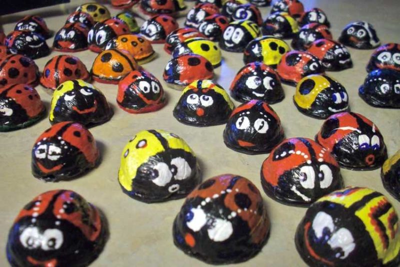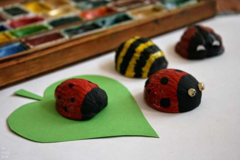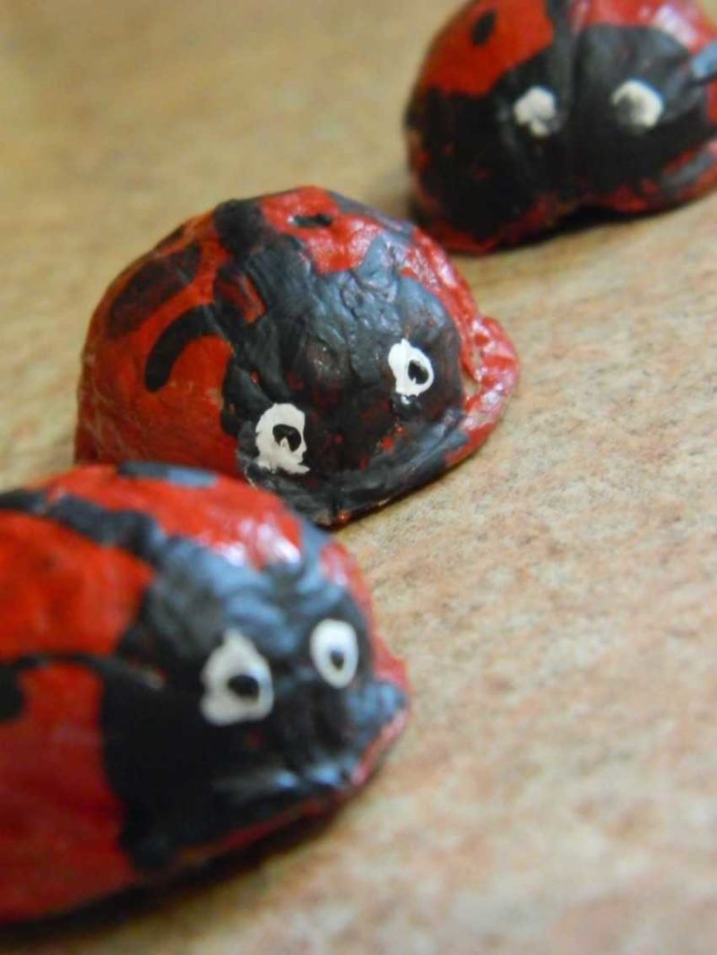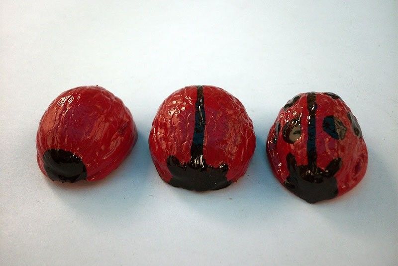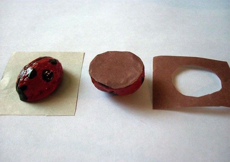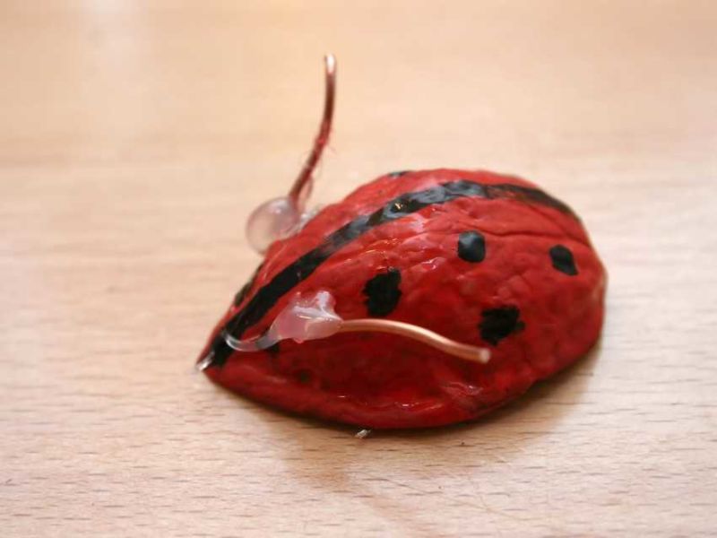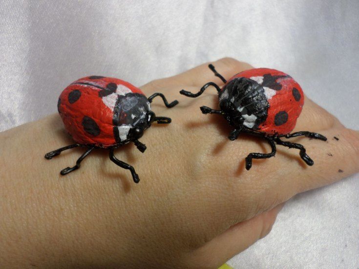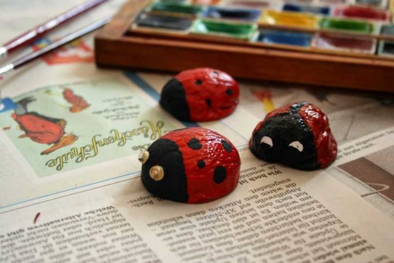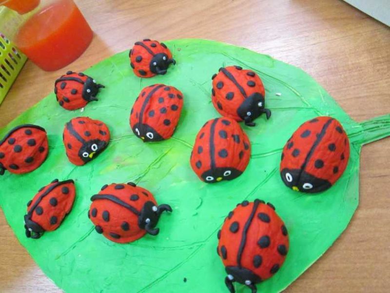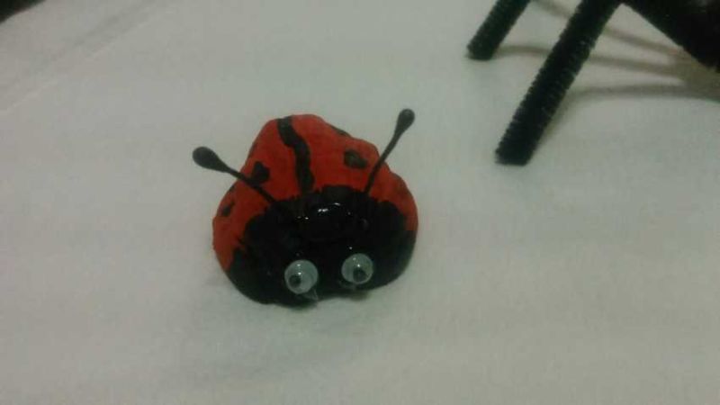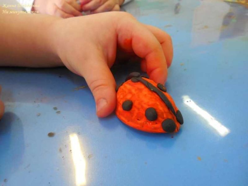 - Покрийте повърхността на черупката с червен пластилин, направете главата, разделителната ивица, точките и антените с черен пластилин. Използвайте бял пластилин за очите.