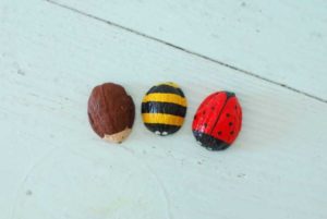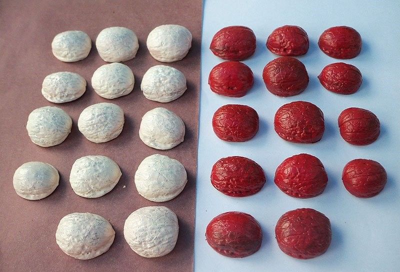 - Вземете 24 орехови половинки, 12 от които са в един цвят, например червен, а другите 12 - в син. Нарисувайте очите. Това са разноцветните светулки.