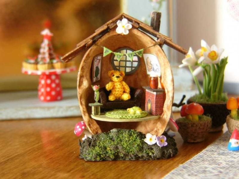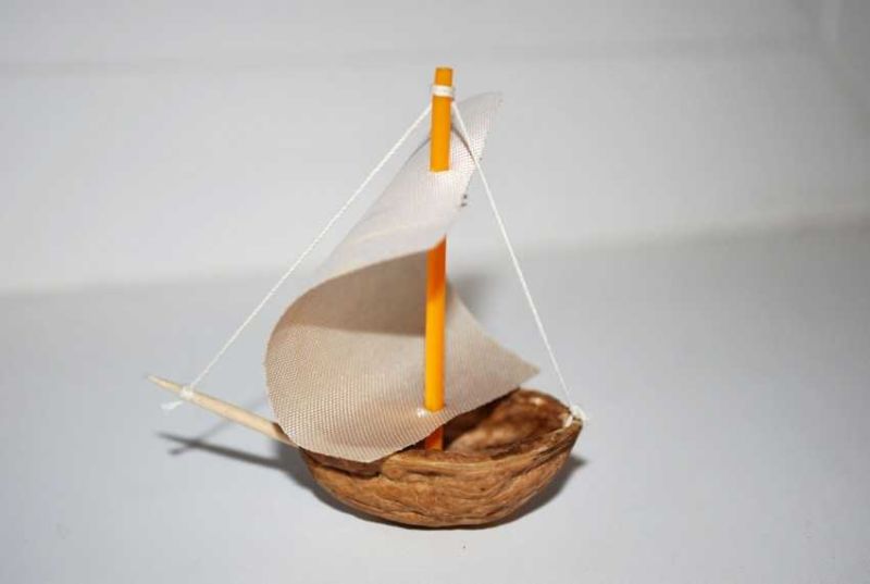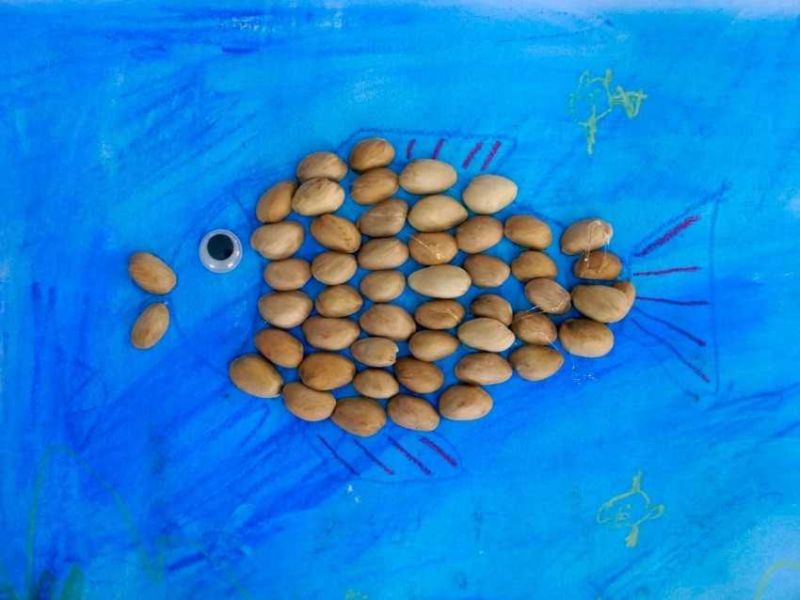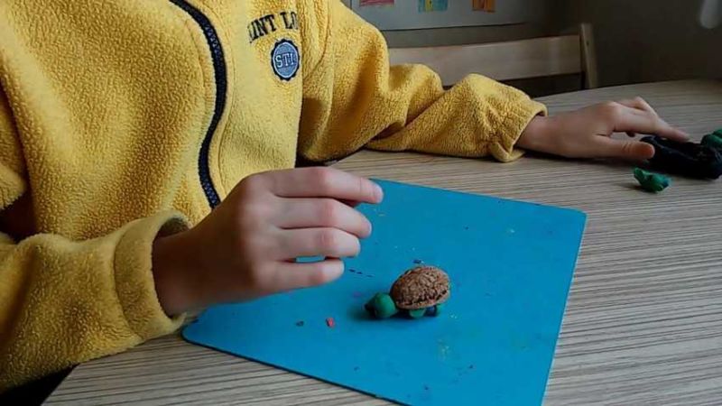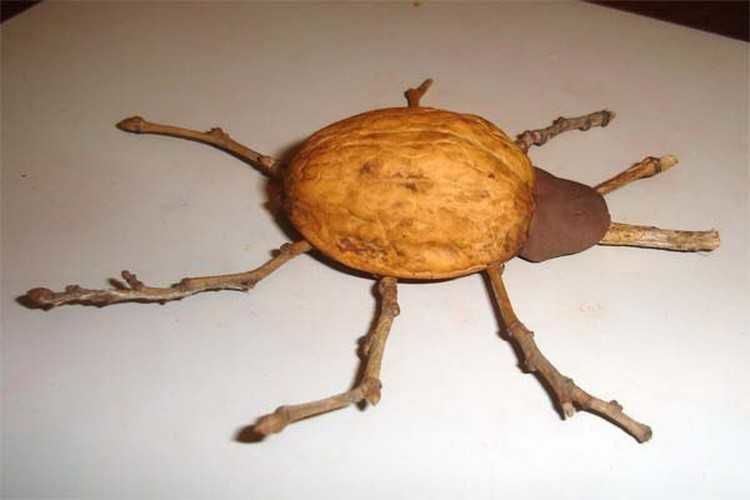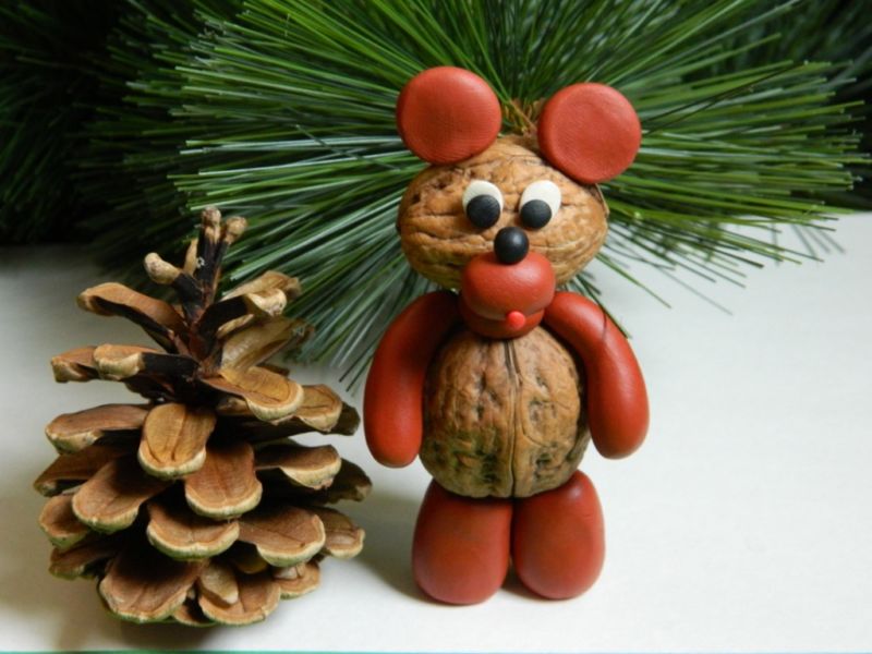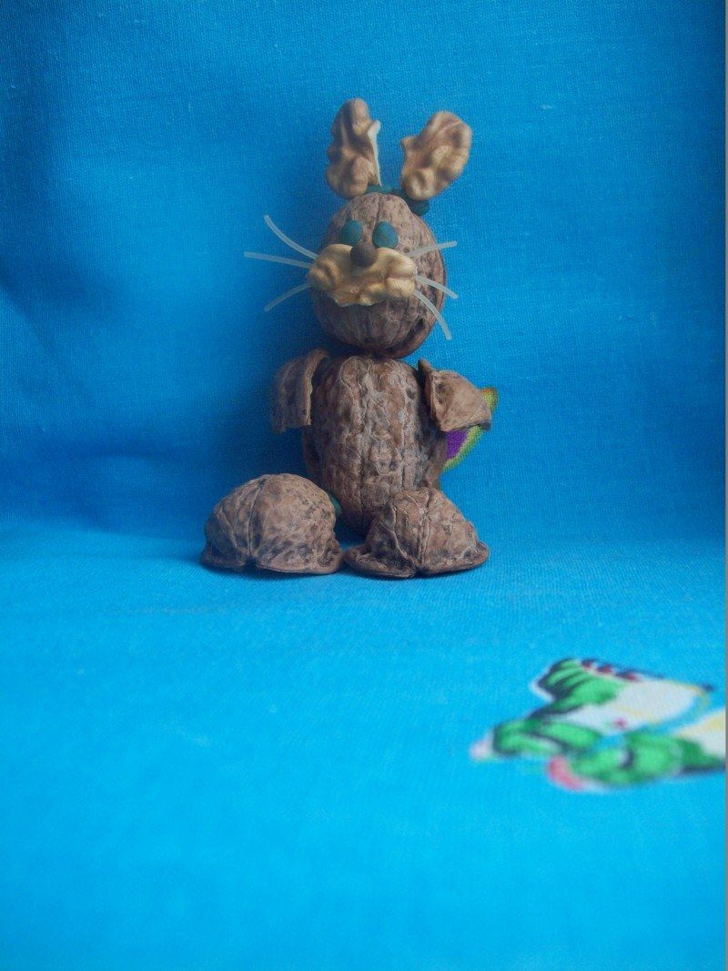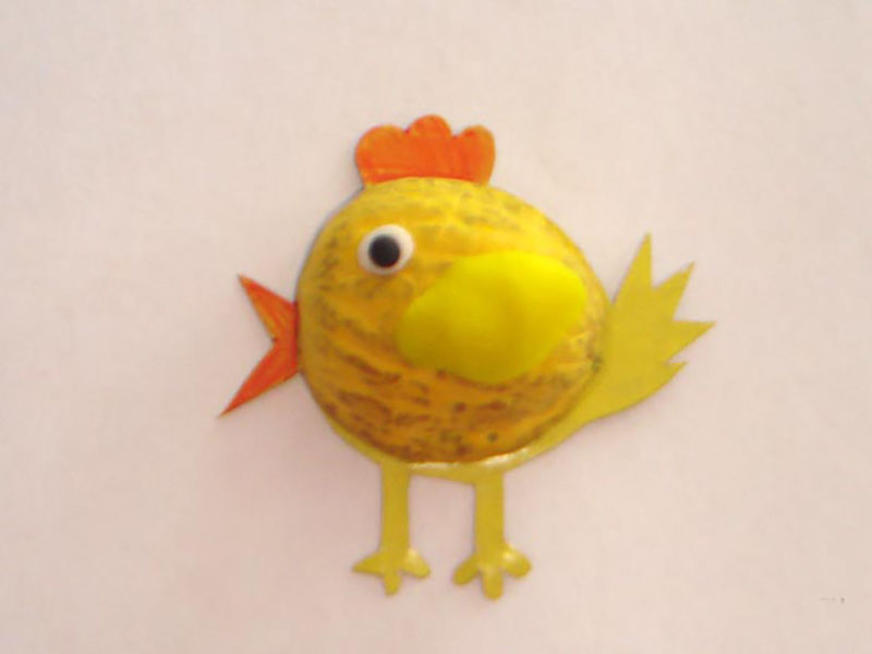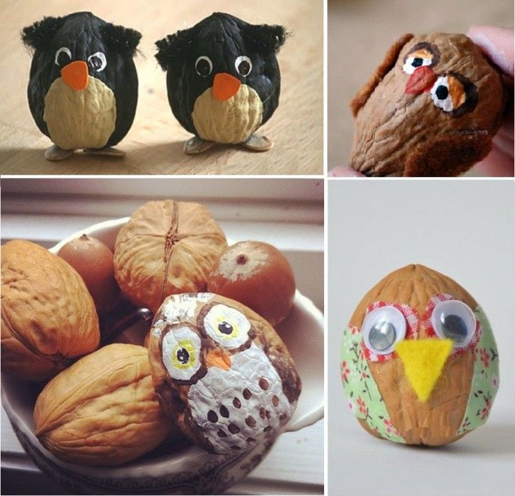 Може да се изработи от цели ядки и половинки, да се скулптира или залепи от хартия глава, лапи.