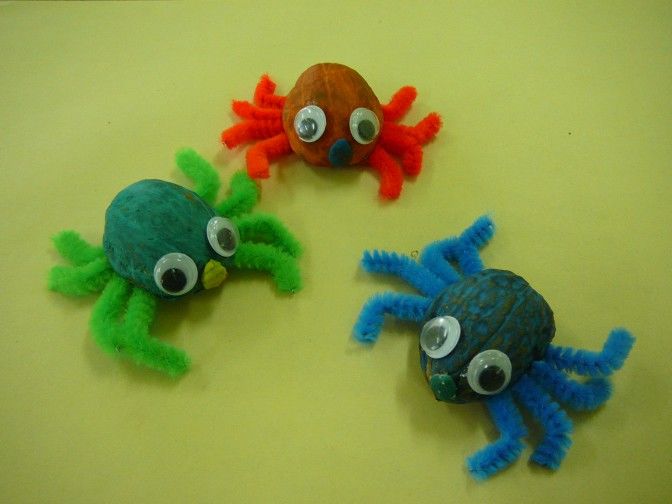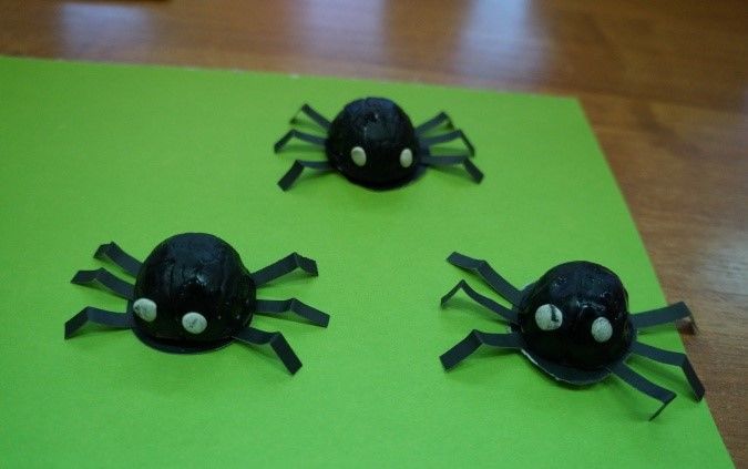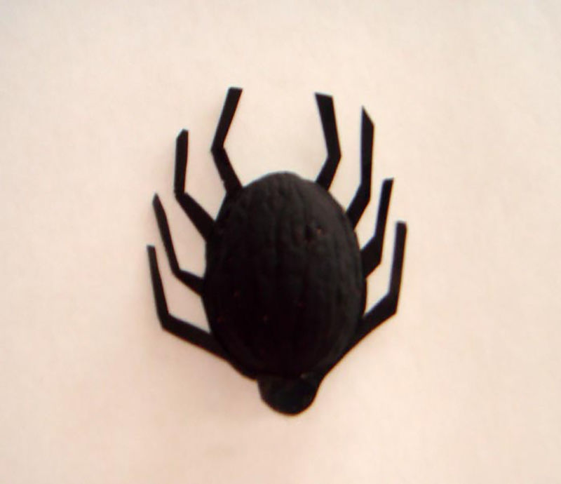 Както и при насекомите, имате нужда от половин орехова черупка, боя или пластилин, лепило и ножица. Телта е по-подходяща за косматите крака на паяка.