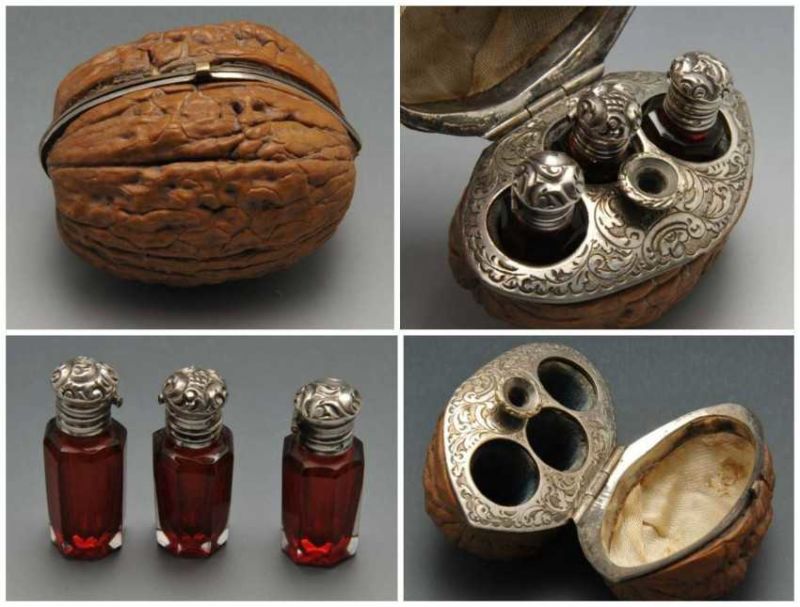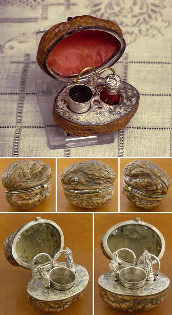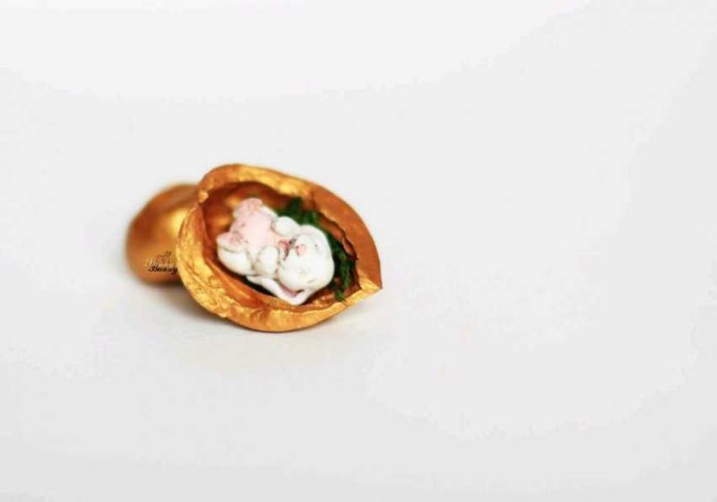 Вземете две половини от орехова черупка, пробийте дупки в долните части и свържете двете половини от едната страна с тел. Сега отворете и затворете кутията. Подплатете го с хубав мек плат, залепете го и поставете мънисто от вътрешната страна.