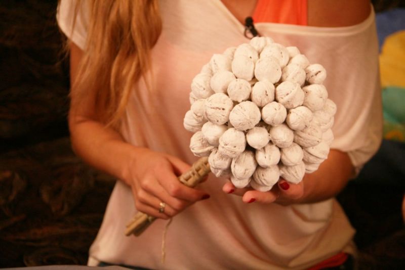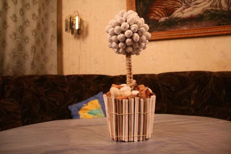 - Залепете черупките плътно една до друга върху топката. Използвайте горещ пистолет. Добавете кафе на зърна, зърна. Поставете стеблото. Дървото е готово.