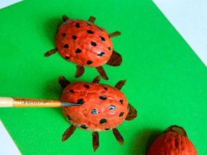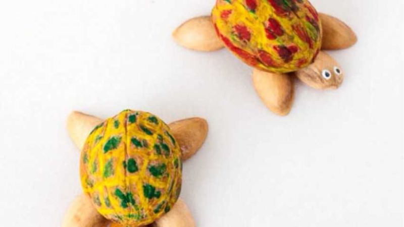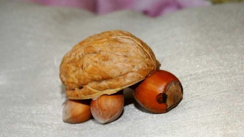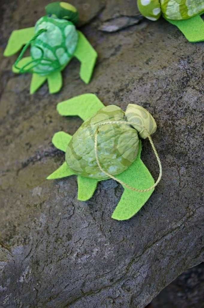 Ръчно изработена костенурка от половинки на орех. Боядисайте естествения материал в кафяво или зелено или оставете естествения цвят на черупката: