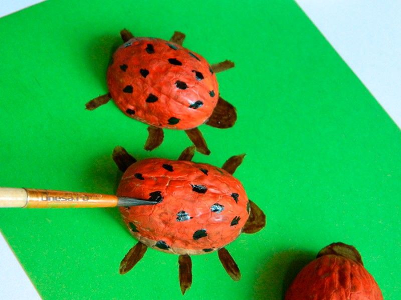 Вземете половината от черупката, боядисайте я в зелено, след това издълбайте или залепете главата и краката; дребните детайли се определят от майстора.