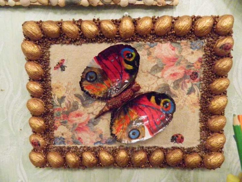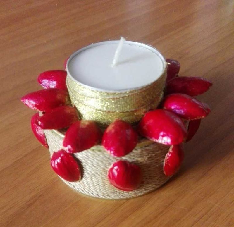 Изрежете кръгла основа, поставете в средата ароматна свещ с поднос, залепете наоколо черупките, предварително боядисани в златист цвят, украсете празните пространства с мъниста.