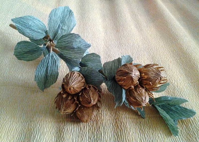 - Залепете вътрешната част нагоре с "листенцата". Правим много такива цветя, от 9 до 15. Разпределяме цветята по целия клон и ги залепваме.