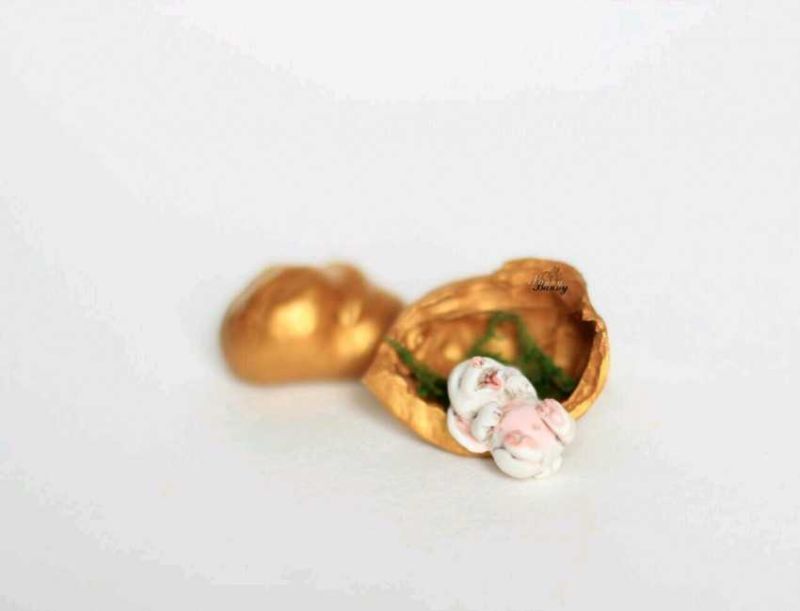 Да се боядисат половинките на черупките в сиво или бяло, да се залепят ушички, опашка от пластилин или малко парче вата, козина.
