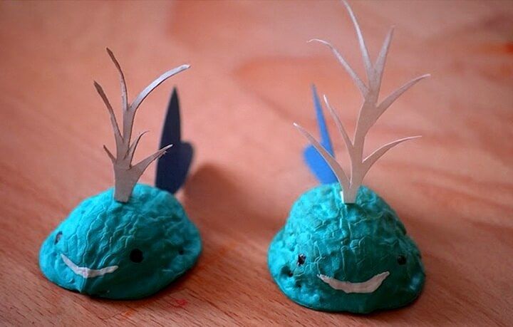 Нанасяме синия или светлосиния цвят върху черупката, така че можете да боядисате повърхността първо с бяла боя и след това със синя (или светлосиня). Изрежете перките и фонтана от хартията, залепете ги към повърхността на тялото, нарисувайте черни очи и очертайте устата. Готовност за китове.