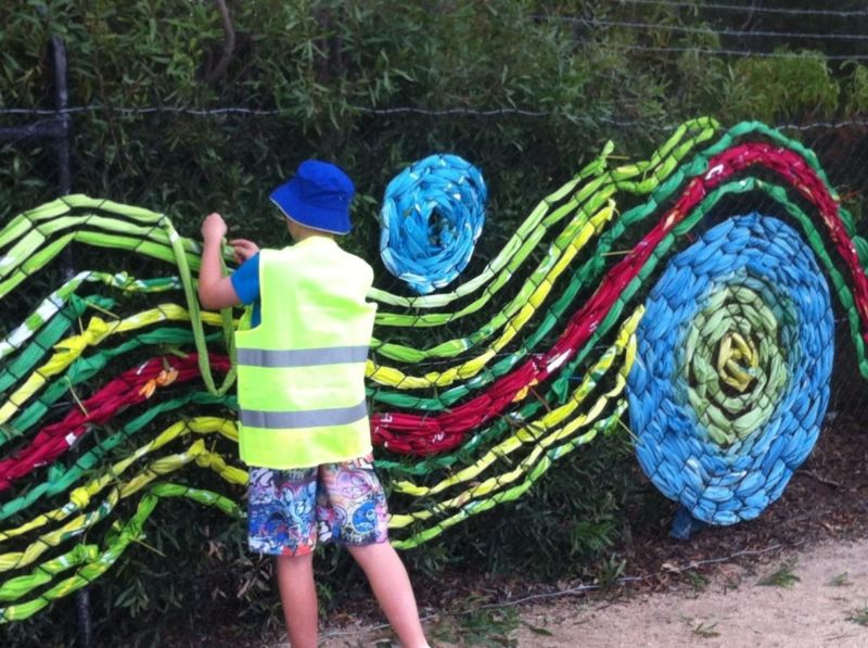 Закрепете началото на лентата, като я завържете за стека. След това промушете торбичката през дупките в оградата и "нарисувайте" от нея каквото пожелаете. Например жълтите торбички са подходящи за слънцето, зелените - за тревата, а сините - за облаците.