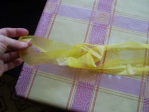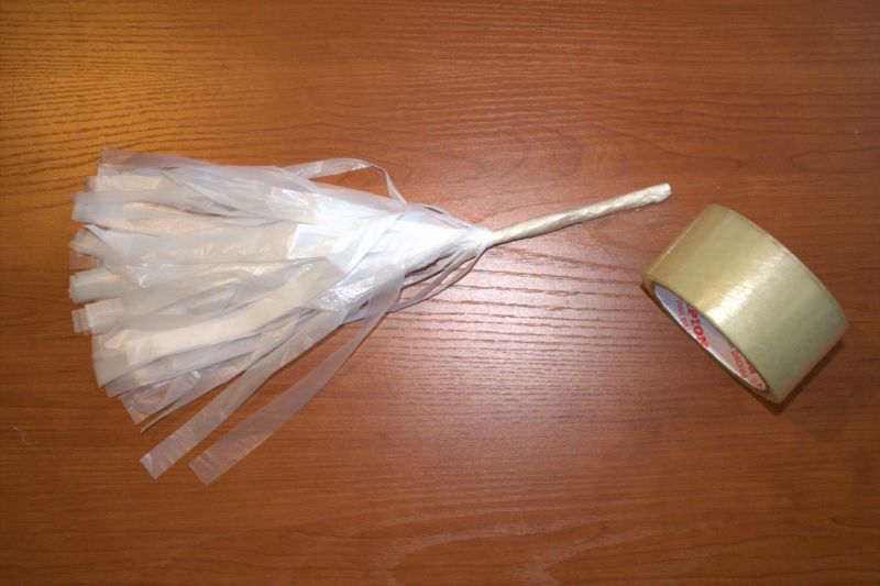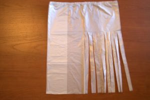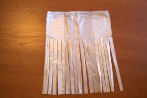 - Изрежете малки, но широки ленти от торбичката. Необходимо е да се създаде ресни: от едната страна нарязваме чантата на тънки панделки. Направете много от тях предварително.