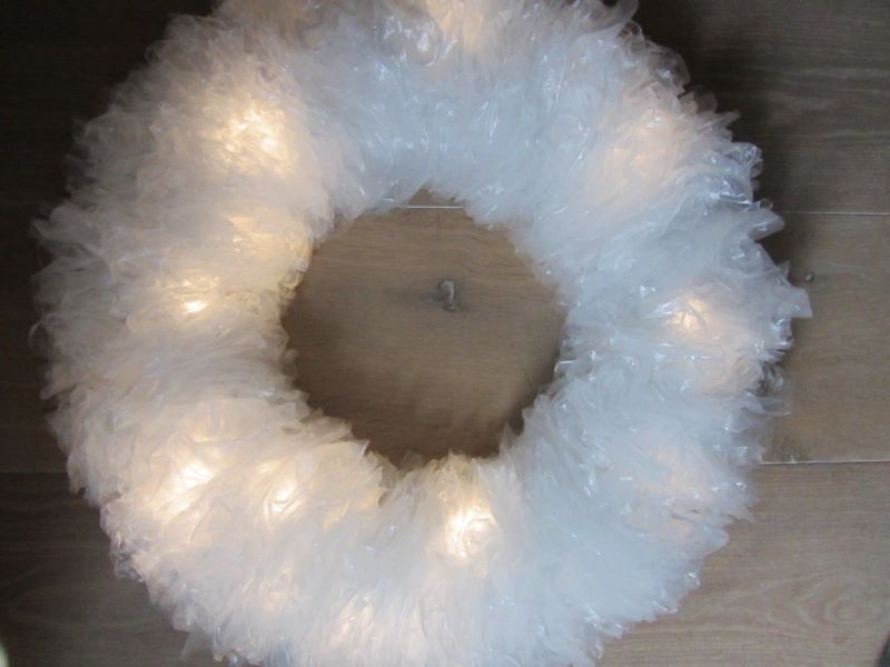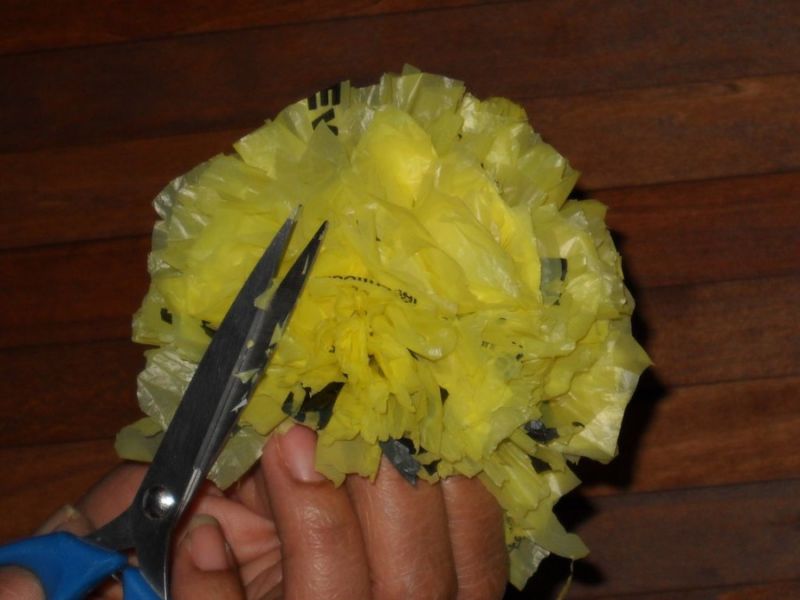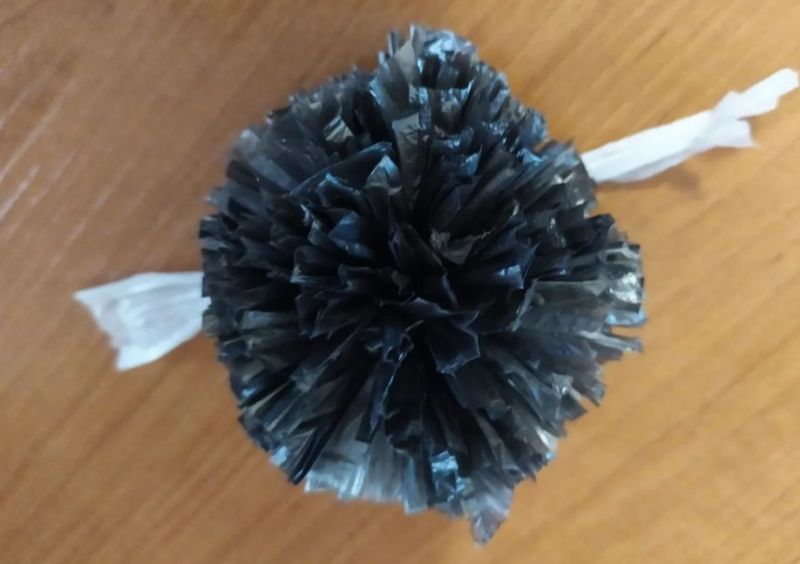 Първо подгответе торбичките, като ги усучете на "прежда". Нарежете ги на колелца и ги скрепете с телбод. Вкарвате един пръстен в друг, след това го огъвате и вкарвате единия му край в другия. По такъв прост начин фиксирайте останалите пръстени и ги навийте на топки.