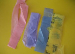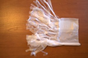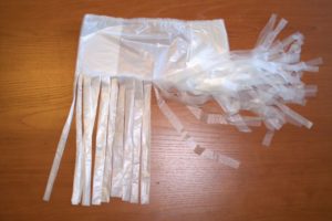 Изрежете дълги ленти от торбичките. Те ще се превърнат в панделки за плетене.
