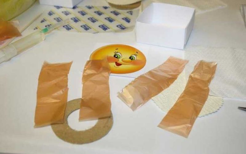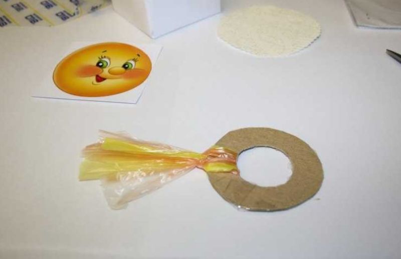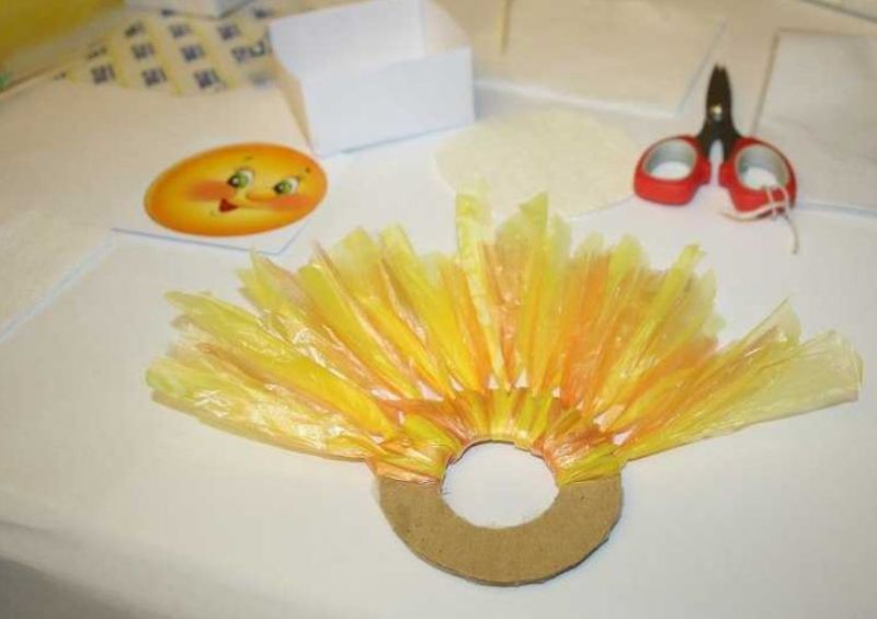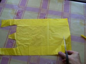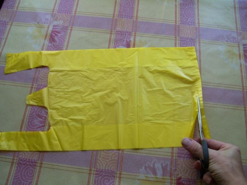 - Изрежете голям кръг от полиетилен. Уверете се, че детето борави внимателно с ножиците.