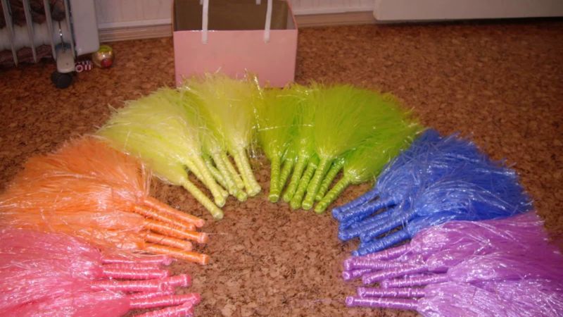 - Панделките са от двете страни, а в средата има държач. Можете да направите и друга версия на пипидастър: изрежете купчината само от едната страна, но тогава разрезите трябва да са по-големи. Така ще получите ресни от едната страна.