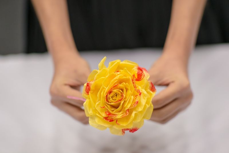 - Сега сглобете розата. Започнете с по-малките венчелистчета и стигнете до по-големите.