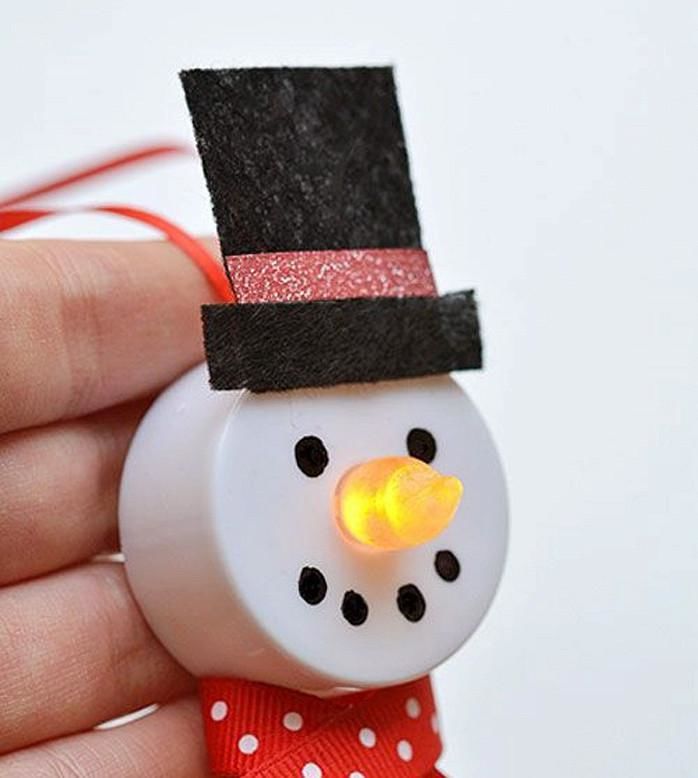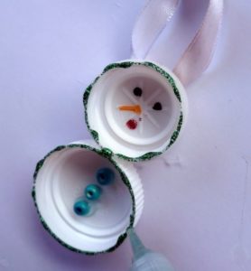 Вземете стара топка за коледна елха и залепете капачетата така, че изпъкналата страна да прилепне към топката. Украсете получената играчка по свой вкус. Можете да направите цял набор от играчки, които си приличат по цвят и декорация. Освободете въображението си.