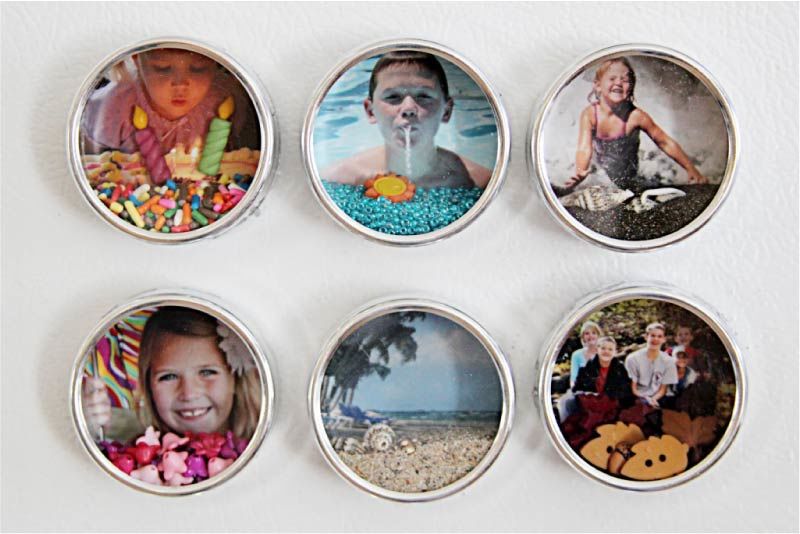 - Залепете магнитите към капачките, като използвате лепило от двете им страни. Можете просто да ги украсите, но много по-добър вариант е да поставите вътре снимки на семейството си.