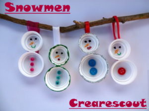 - Вземете малко парче картон за основа. Поставете 2 капака около ръба и залепете тялото на снежния човек. Изпъкналата страна трябва да сочи нагоре.