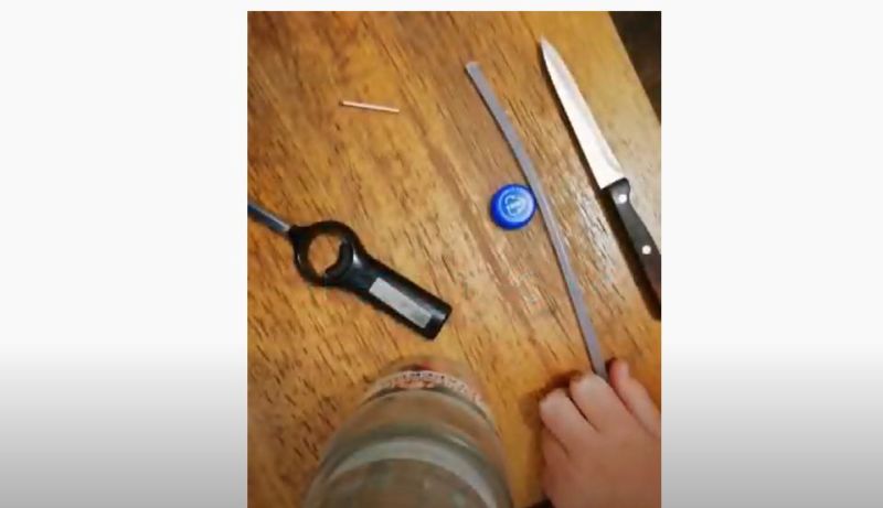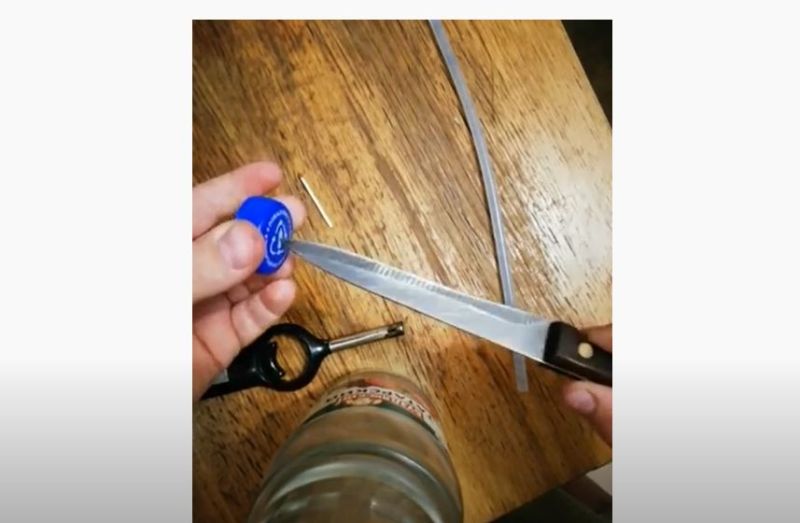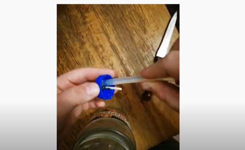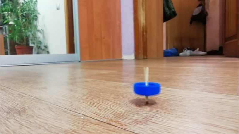 Изрежете дупка в центъра на капака и прокарайте през нея клечка за зъби с остър предмет в единия край. Залепете го, изчакайте да изсъхне и се насладете на тази забавна игра.