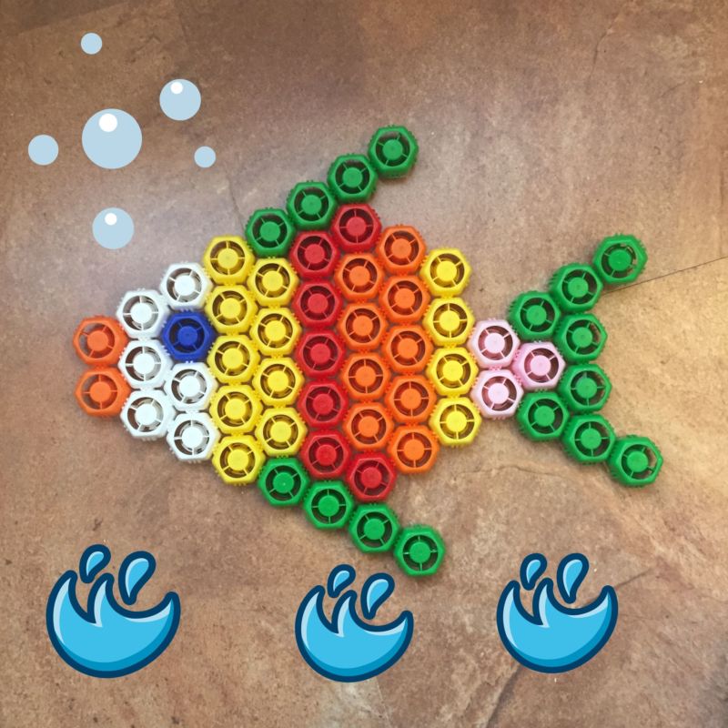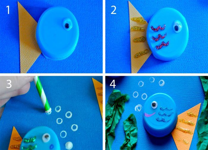 Изрежете опашките на рибите от хартия или картон, залепете ги към синята основа и залепете пластмасовите капаци (тялото на рибата) отгоре. Продължете с декорацията. Помолете детето си да украси рибките по свой вкус. Това могат да бъдат очи, люспи, различни шарки и въздушни мехурчета, изпускани от рибата.