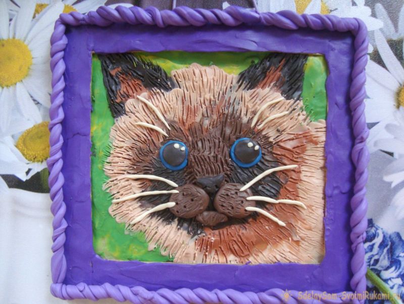 - Напръскайте затоплена маса от спринцовката върху готовата рисунка на котка, която се любува на пеперуда, затоплена с гореща вода за 30-40 секунди.
