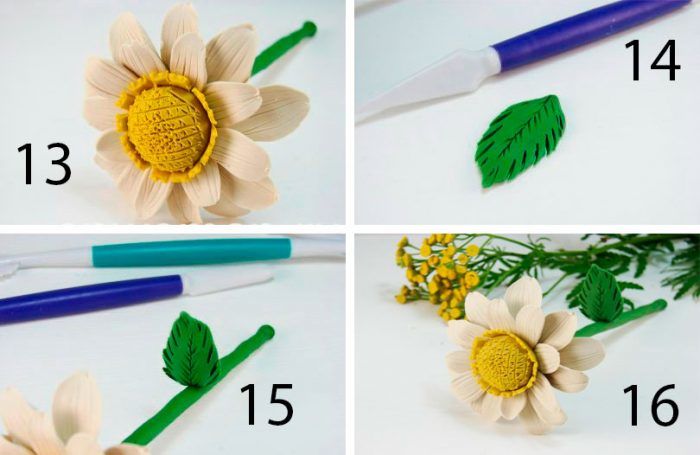 - Сега правим листа, разточваме ги в пласт пластилин, изрязваме ги на триъгълни листа. 3-4 листа. Увийте листата около кочана.