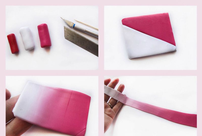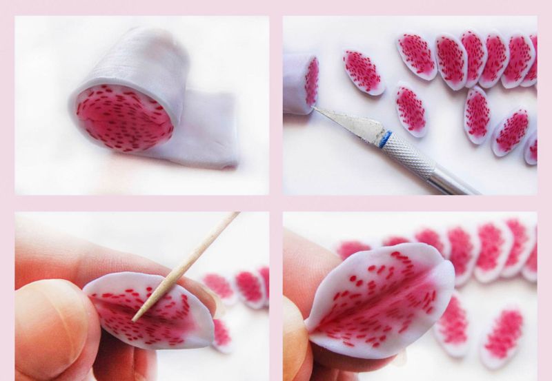 Разточете парче бяла глина, разделете го на 5-6 части и го оформете като овал. Разпределете розовата глина в центъра на всяко листенце, а зелената - в основата на листенцето.
