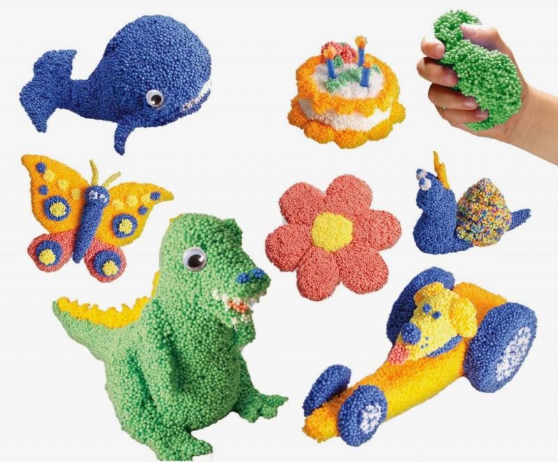 Чудесен материал за творчество, с ярки, наситени цветове и подходящ за най-малките деца, които тепърва започват да търкалят топки по масата. Тази глина не полепва по ръцете, килимите и подовете. Състои се от безопасни съставки, като за основа се използват топчета пяна и глицерин.