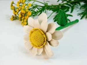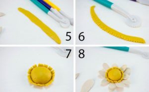 - Разточете жълта топка - в центъра на цветето, притиснете. Разточете жълтата лента, направете малки разрези, залепете я около центъра и прикрепете листенцата.