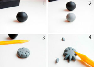Направете надлъжни вдлъбнатини върху венчелистчетата с остра пръчка или тел. Поставете малки парченца сив пластилин - тичинки - на дълги тънки телчета, а на едно от телчетата залепете топче жълт пластилин - стълбче.