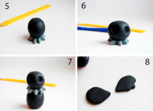 - Разточете синя топка, оформете я като тяло, глава и опашка. Заготовката се оказва плоска.