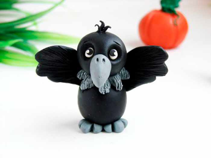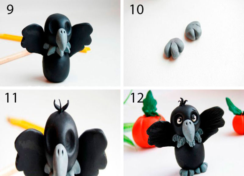 - Нека направим еднакви крила, смесете черен пластилин с бял, добавете малко синьо, направете релеф на перата.