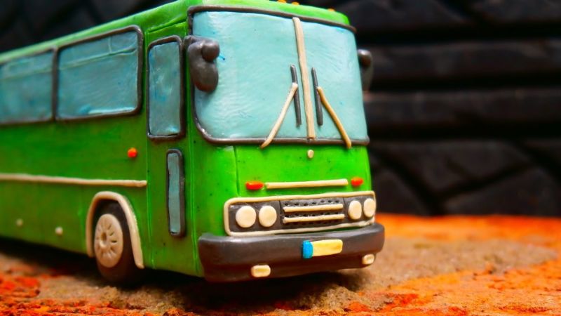 - Разточете четири еднакви черни кръга и ги сплескайте на масата, за да направите колелата. Прикрепете ги към автобуса.