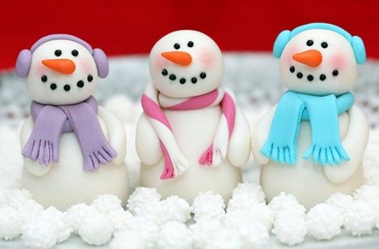 - Разточете три бели бучки, сложете една върху друга, върху бучката сложете шапка, залепете червен нос, направете очи и уста.