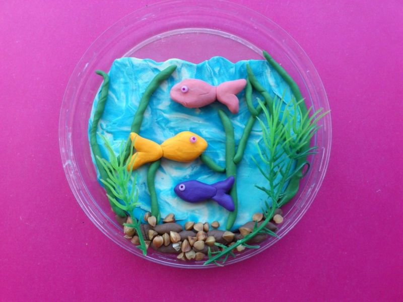 Можете да създадете картина, като разстелете глина върху съществуваща рисунка и добавите триизмерни елементи, например рибки в аквариум.