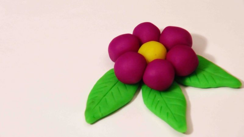 - Вземете червен или лилав пластилин и разточете топчета в дланите си - това са листенцата. Има общо 6 венчелистчета, а средното е топче с различен цвят. Всичко се поставя в кръг върху листата, като в центъра се поставя седма топка. Хубаво цвете!