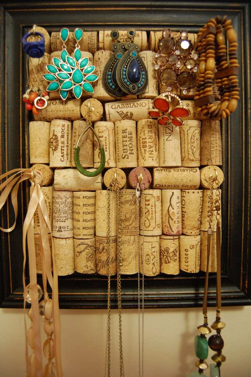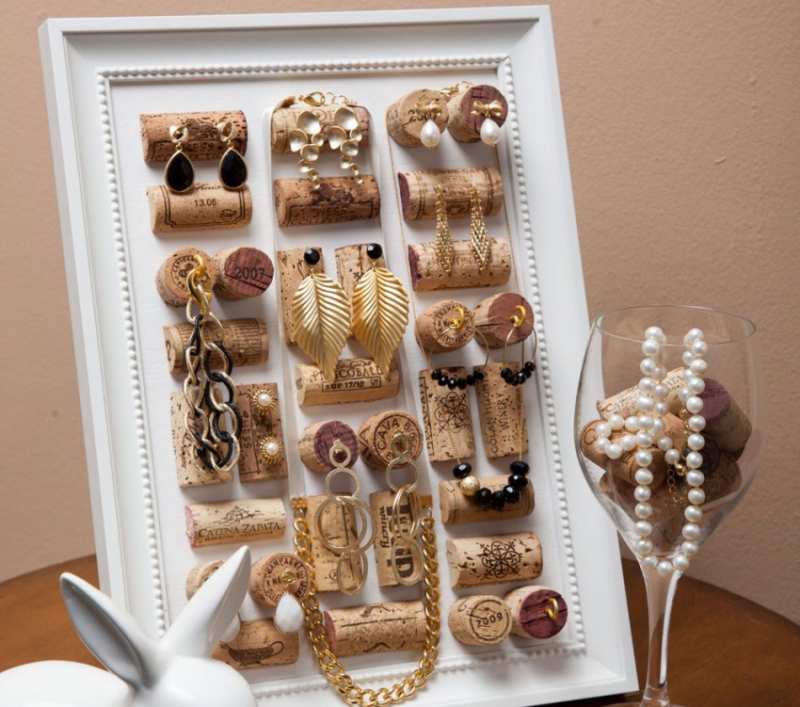 Ако сте собственик на много аксесоари за бижута, за да избегнете заплитането на верижките, постоянното разединяване на обеците, не е излишно да си направите удобно приспособление от плат, облепено с тапи с поставени игли, на което да закачате бижута и накити.