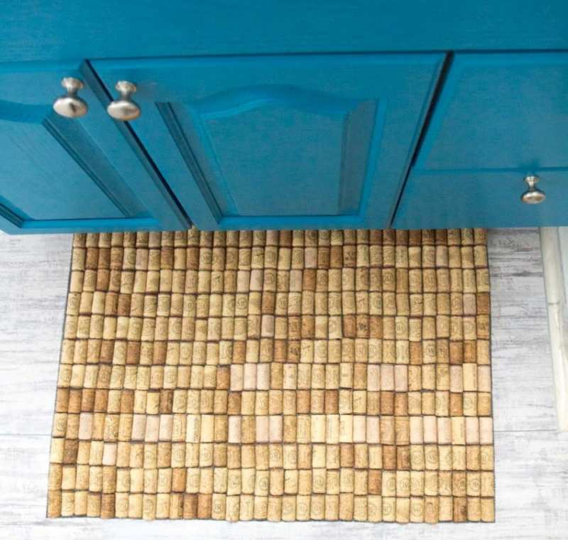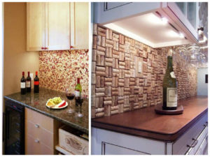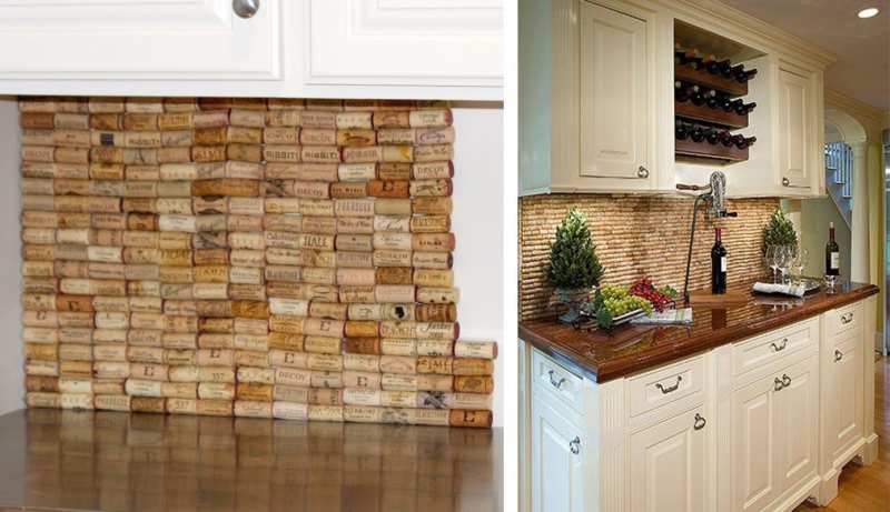 Корковите половинки се шлайфат с шкурка в точката на срязване и се прикрепят към влагоустойчивия гипсокартон. На тази стена могат да се окачат малки аксесоари, но е по-добре да се покрие със стъкло, за да се предотврати омазняването.