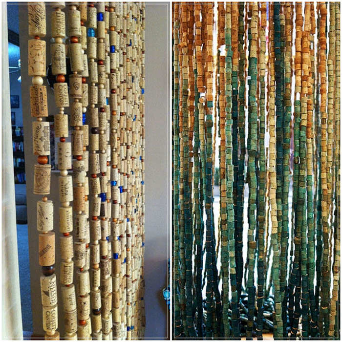 Зонирането на стаята с коркови щори изглежда доста оригинално. Пробийте дупки в корковите щори, нанижете ги на въдица, шнур или дебел конец, преплетени с други декоративни елементи, закрепете краищата им към лайсна и я закрепете над вратата.