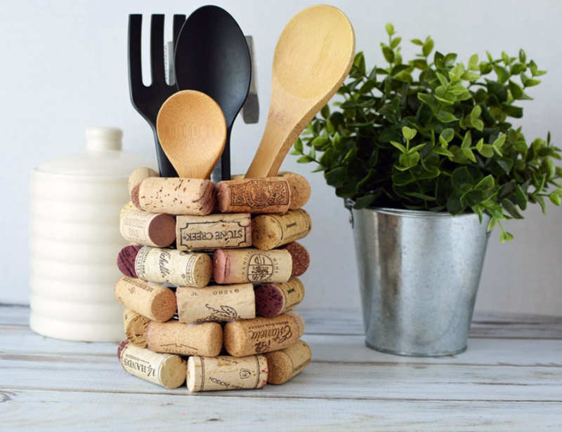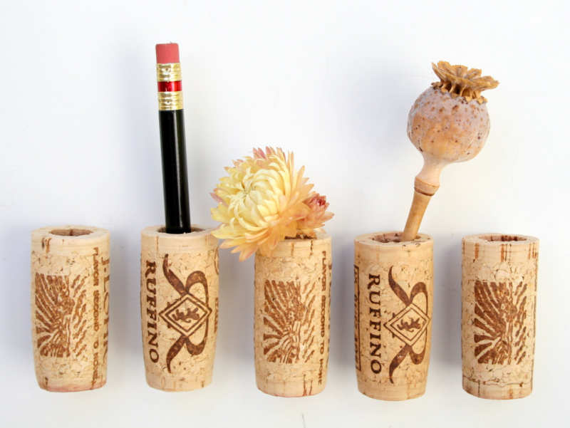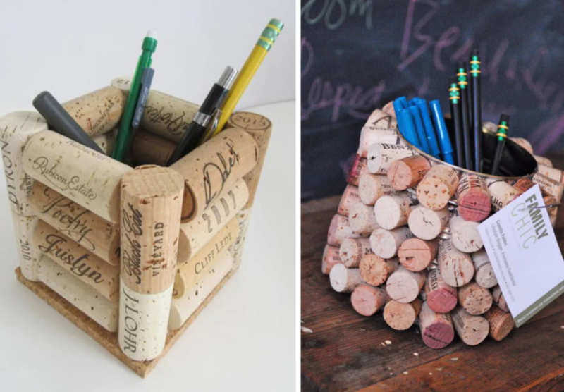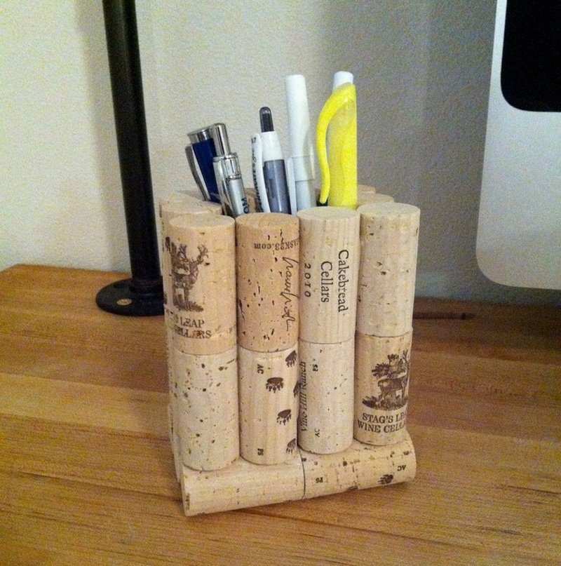 Актуална тема са органайзерите за канцеларски материали, които често падат и се губят, търкалят се под дивана или леглото. Необходими са ви десетина коркови тапи, за да създадете добре оформена конструкция с тънък шперплат като дъно. Не е погрешно просто да залепите консервна кутия.