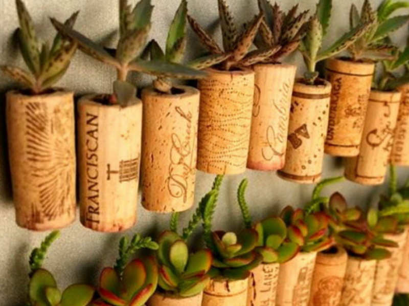 Всички саксии и сандъчета са завършени в подобен на този стил, за да придадат на обстановката хомогенност. Десенираните съдове за икебани и сушени цветя изглеждат чудесно. Корковите тапи са подходящи за отглеждане на сукуленти, като задържат влагата в почвата за дълго време. Методът дава възможност да подредите на вратата на хладилника красива цветна леха върху магнити.
