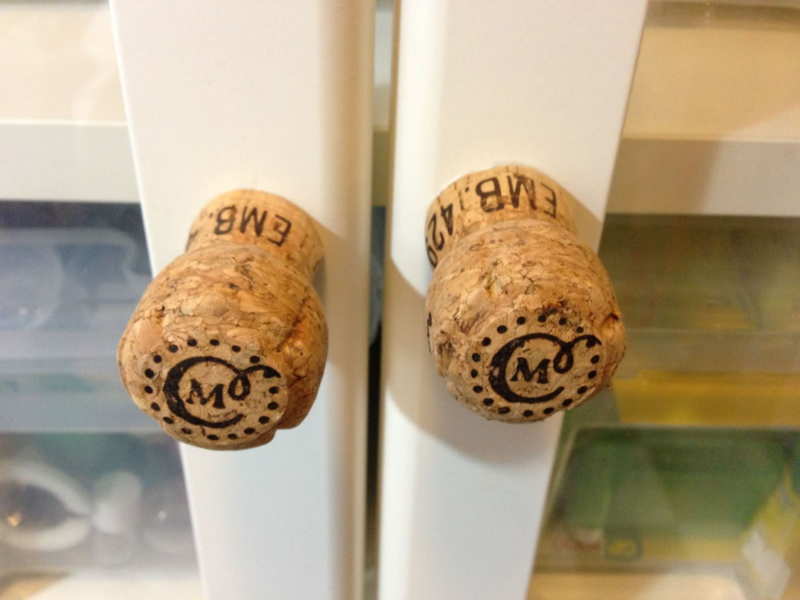 Износените мебелни дръжки на чекмедже, скрин са успешно заменени с мостри от шампанско, което удобно решава проблема с отварянето и затварянето на чекмеджетата.
