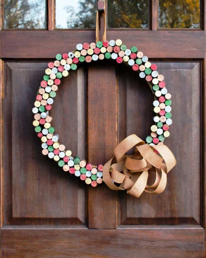 Коледният венец изглежда невероятно. Първоначално венецът от вестници се приготвя, като се усуква на пликче и се навива на конец. След това се залепват тапите, като се редуват с панделки, ярки плодове и елхови лапички.