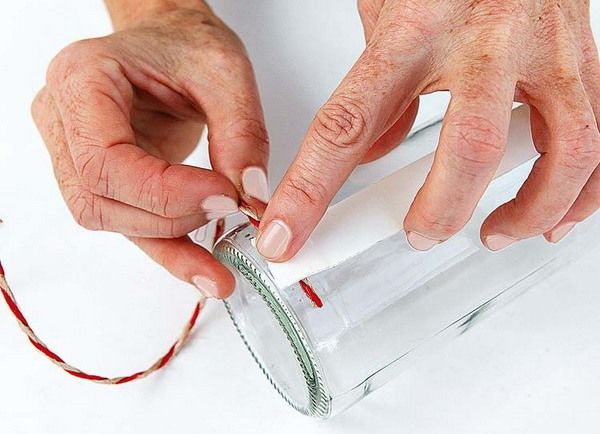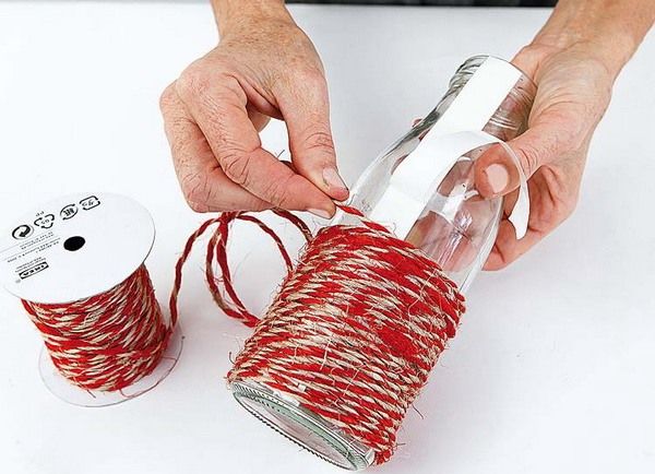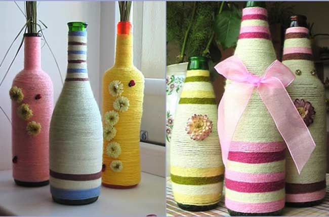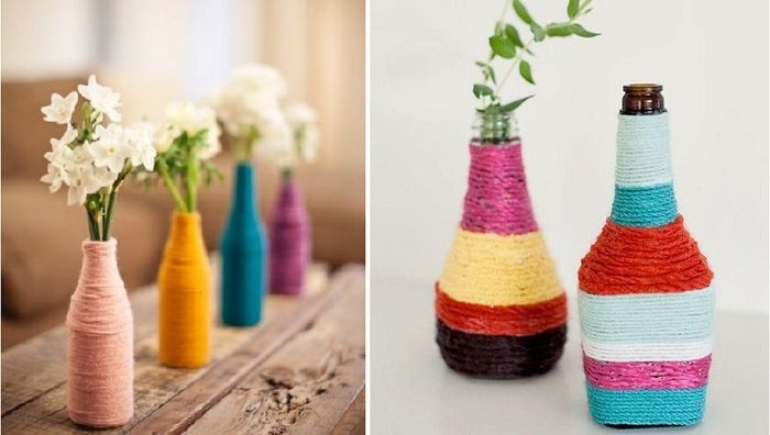 Оригинално и красиво изглежда ваза, изработена от разноцветни прежди, залепени за стара ваза, която е излязла от мода, или бутилка. Преждата може да бъде вълнена или памучна. Увийте го много плътно на пластове, така че да няма пролуки в стъклото и другия материал, от който е направен контейнерът.