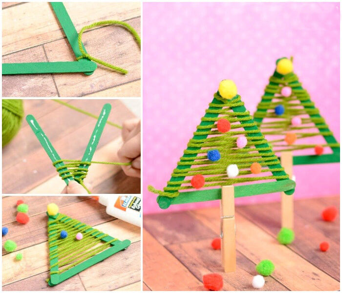 - Украсете получените елхички с малки помпони от прежда или малки коледни украшения.